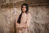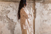 Una giacca di lino beige, stampata a mano con la tecnica block printing, dove i fiori di loto intrecciano l...