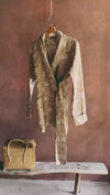Una giacca di lino beige, stampata a mano con la tecnica block printing, dove i fiori di loto intrecciano luce sul tessuto. La biancheria è stata accuratamente scelta a Jaipur dove sono andata alla ricerca del colore e del materiale più adatto per dare equilibrio. Il beige lascia spazio ai dettagli, disegni fatti uno ad uno, con quella calma tipica delle cose ben fatte. La linea è morbida e versatile, pensata per chi ama la semplicità ma non vuole mai rinunciare alla storia dietro ogni capo.